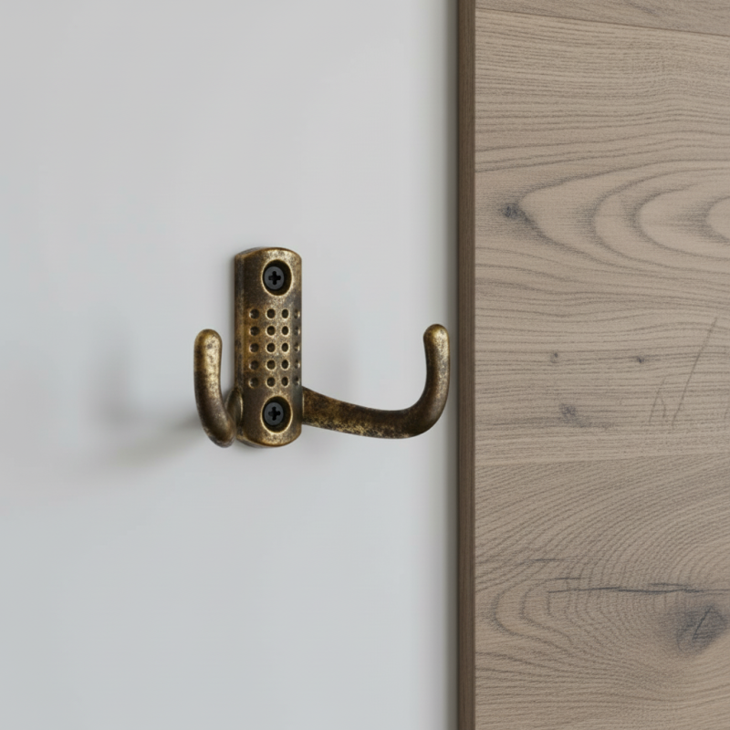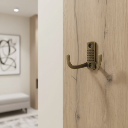 Stylový nábytkový věšák se dvěma háčky, který díky povrchové úpravě mosaz patina dodává interiéru elegantní, mírně vintage vzhled. Ideální do klasických i rustikálních prostor, ale také jako kontrastní prvek v moderním nábytku.
