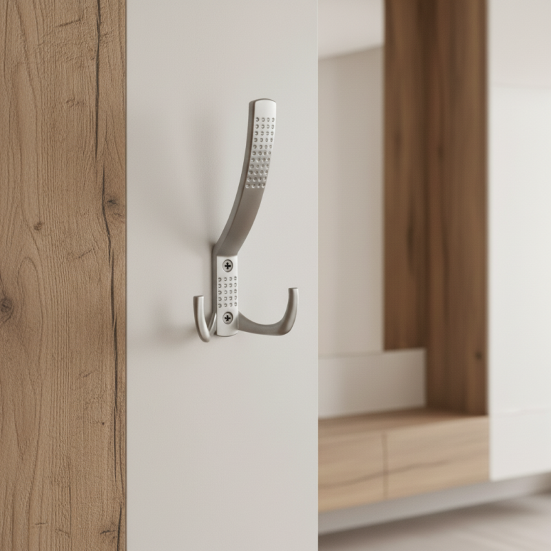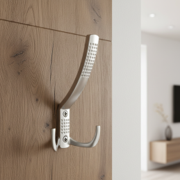 Moderní nábytkový věšák větších rozměrů se dvěma pevnými háčky, navržený pro každodenní používání i při vyšším zatížení. Matný chrom dodává věšáku nadčasový, elegantní a univerzální vzhled, který se snadno kombinuje s jakýmkoli interiérem.
