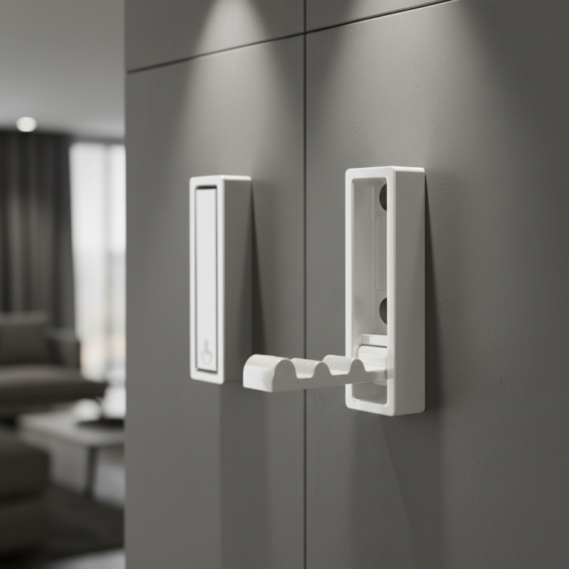 Jednoduchý přední závěs s výškou 70 mm a šířkou 20 mm. Šrouby pro upevnění jsou součástí závěsu. Závěs se jednoduše vyklopí stisknutím. Věšák se montuje na povrch a není třeba ho frézovat do nábytku nebo materiálu.