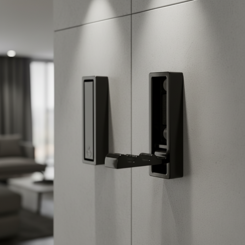Jednoduchý přední závěs s výškou 70 mm a šířkou 20 mm. Šrouby pro upevnění jsou součástí závěsu. Závěs se jednoduše vyklopí stisknutím. Věšák se montuje na povrch a není třeba ho frézovat do nábytku nebo materiálu.