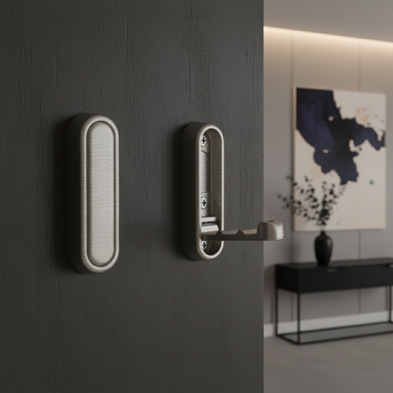 Jednoduchý přední závěs s výškou 74 mm a šířkou 24 mm. Montážní šrouby jsou součástí dodávky. Závěs se jednoduše vyklopí stisknutím. Věšák se montuje na povrch a není třeba ho frézovat do nábytku nebo materiálu.