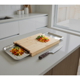 Praktická a designová bambusová krájecí deska s integrovanými nerezovými nádobami je ideálním pomocníkem do moderní kuchyně. Promyšlená konstrukce umožňuje pohodlnou přípravu surovin bez nepořádku – nakrájené potraviny jednoduše sesunete přímo do vyjímatelných nádob.