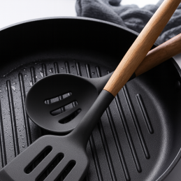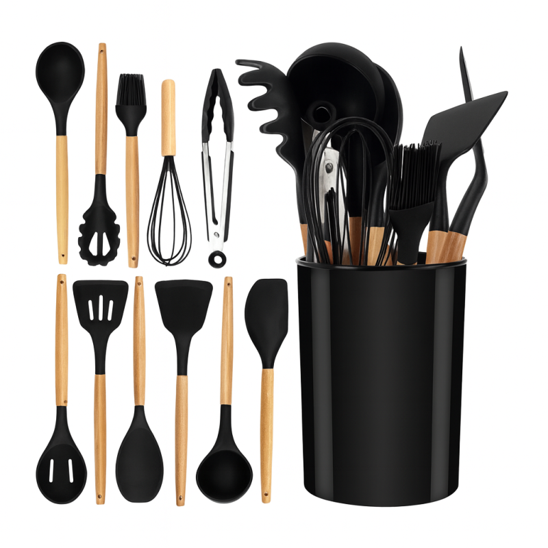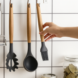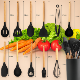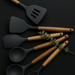 Dopřejte si praktické a stylové řešení s touto exkluzivní sadou 11 kusů kuchyňského náčiní, která spojuje moderní design v černé barvě s elegancí přírodního dřeva. Sada je navržena tak, aby zvládla každodenní vaření, pečení i přípravu jídel a zároveň esteticky doplnila váš kuchyňský interiér.