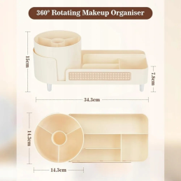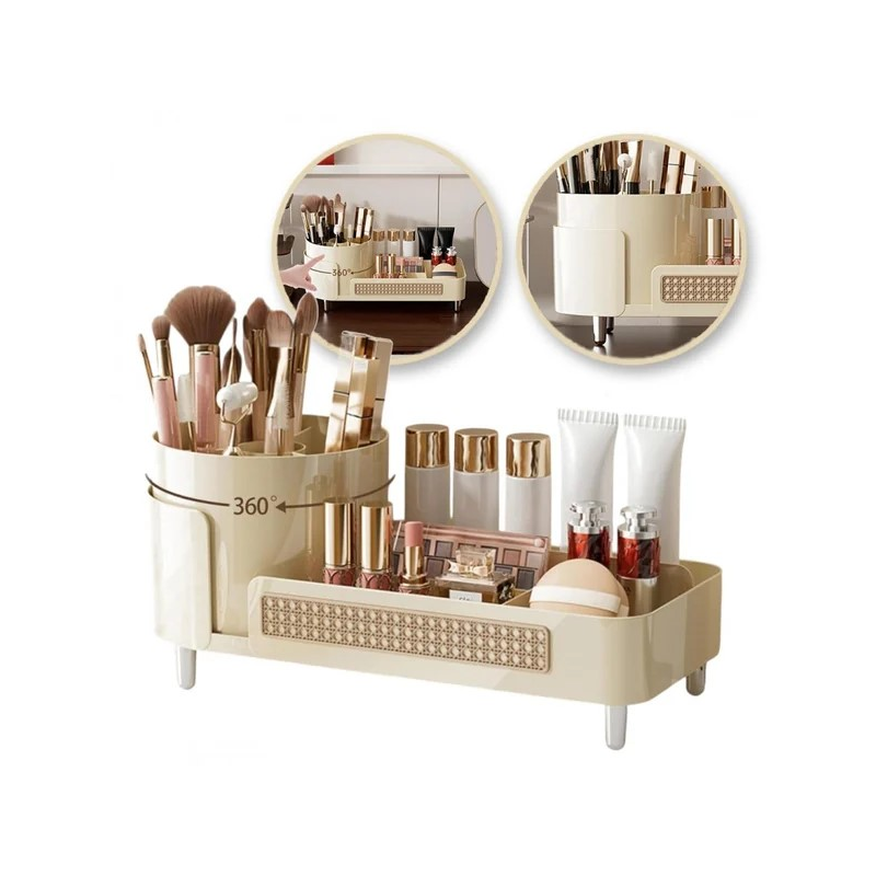 Organizér je vybaven otočným držákem na štětce, který se otáčí o 360°, což umožňuje rychlý a pohodlný přístup ke všem uloženým pomůckám. Spodní část nabízí praktické přihrádky vhodné na rtěnky, krémy, make-up, parfémy nebo drobnou kosmetiku. Drážkované stěny dodávají organizéru moderní a elegantní vzhled.