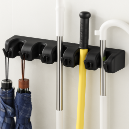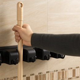 Otvory mají válečkové kuličky, které se přizpůsobí tloušťce násady koštěte nebo mopu a pevně je drží. Jejich uvolnění je velmi snadné, stačí lehce zvednout násadu koštěte. Velmi snadná instalace pomocí šroubů, které jsou součástí balení.