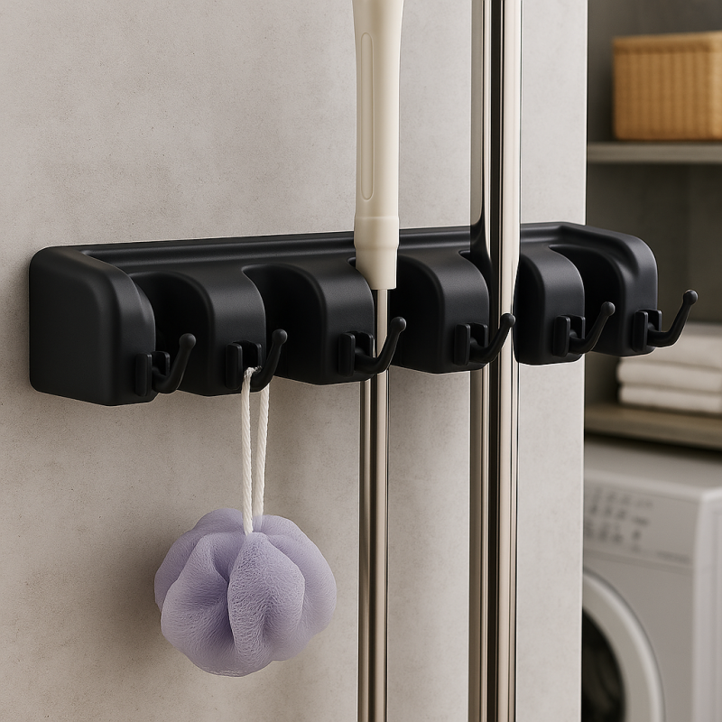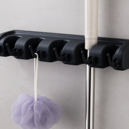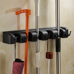 Stojan na úklidové pomůcky, který vám umožní uspořádat kuchyň nebo spíž praktickým a prostorově úsporným způsobem. Díky 5 otvorům a 6 háčkům je ideální pro zavěšení košťat, mopů, smetáčků i kuchyňských utěrek. .