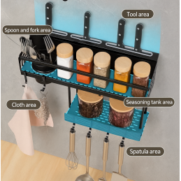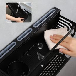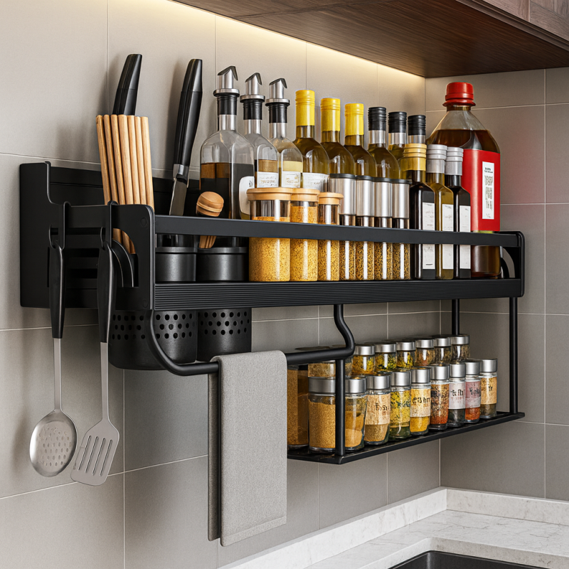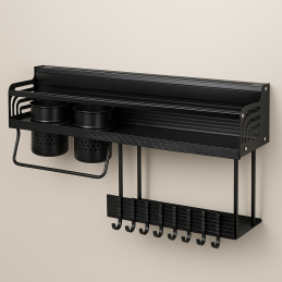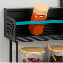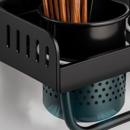 Praktická závěsná kuchyňská polička XENIA v černé matné barvě je multifunkčním řešením pro moderní domácnost. V jednom kompaktním produktu kombinuje držák na koření, stojan na nože, odkapávač na příbory a držák na utěrky, díky čemuž se vaše kuchyně stane přehlednou a uklizenou.