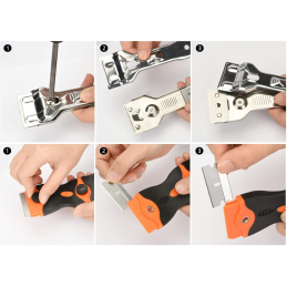 Balení obsahuje 5 ostrých kovových čepelí na odolné nečistoty a 1 plastovou čepel na citlivé povrchy. Čepele lze snadno a rychle vyměnit.