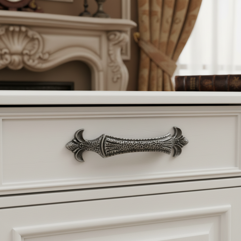 Úchytka VERDI v povrchové úpravě starobronz přináší do interiéru harmonickou kombinaci klasického stylu a řemeslného charakteru. Její bohaté reliéfní zdobení a elegantně tvarované linie odkazují na historické prvky, které dokonale doplní vintage, rustikální i tradiční nábytek.