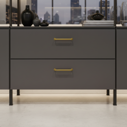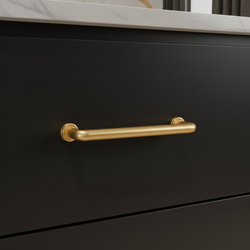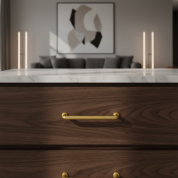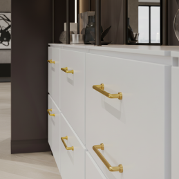 Úchytka NURIA v provedení kartáčované zlato přináší do interiéru luxusní a zároveň moderní výraz. Její hladké, zaoblené linie doplněné decentními prstenci na koncích působí sofistikovaně a nadčasově. Kartáčované zlato vytváří elegantní teplý odstín, který dokonale ladí s bílým, tmavým i přírodním nábytkem.