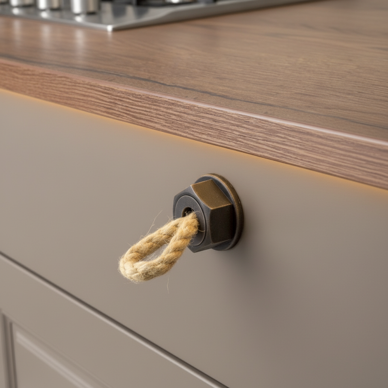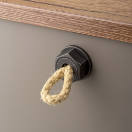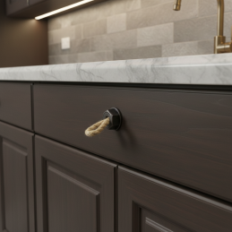 Knopka SPACCATA v povrchové úpravě starověká černá představuje originální kombinaci dekorativní plastové základny a pevného přírodního lana. Tento design spojuje řemeslný, venkovský a industriální styl, díky čemuž se knopka okamžitě stává dominantním detailem na komodách, skříňkách či kuchyňských dvířkách.