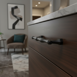 Elegantní úchytka RUNA v černém matném provedení zaujme svým jemně tvarovaným profilem a decentními detaily na koncích. Díky nadčasovému designu je vhodná do moderních i klasických interiérů – kuchyně, koupelny, ložnice či obývacího pokoje.
