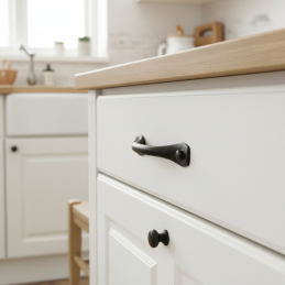 Úchytka SULKY v povrchové úpravě staročerná je dokonalou volbou pro ty, kteří chtějí do svého interiéru vnést prvek tradičního řemeslného stylu. Kombinuje jemně tvarovaný oblouk s rustikálním povrchem, který dodává nábytku autentický, mírně industriální výraz.