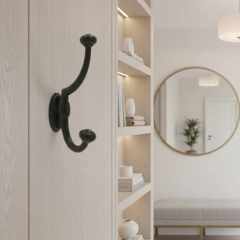Věšák je určený pro zadní montáž do nábytku nebo nábytkové stěny, což zajišťuje čistý design bez viditelných upevňovacích prvků. Kvalitní kovové zpracování garantuje vysokou pevnost, stabilitu a dlouhou životnost i při každodenním používání.