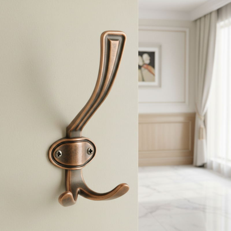 Provedení v antické mědi dodává věšáku výrazný historický charakter s jemnou patinou, která krásně doplní dřevěný nábytek i rustikální prvky interiéru.