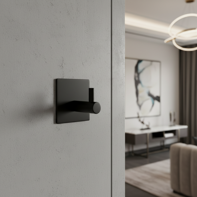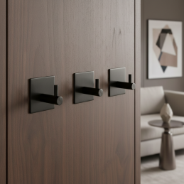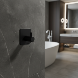 Moderní, jednoduchý a mimořádně praktický samolepicí věšák GINNA v elegantním provedení černá matná je skvělou volbou do koupelen, kuchyní či na jakýkoli hladký povrch v domácnosti. Matná černá barva působí luxusně a dokonale ladí s moderními interiéry i černými koupelnovými doplňky.