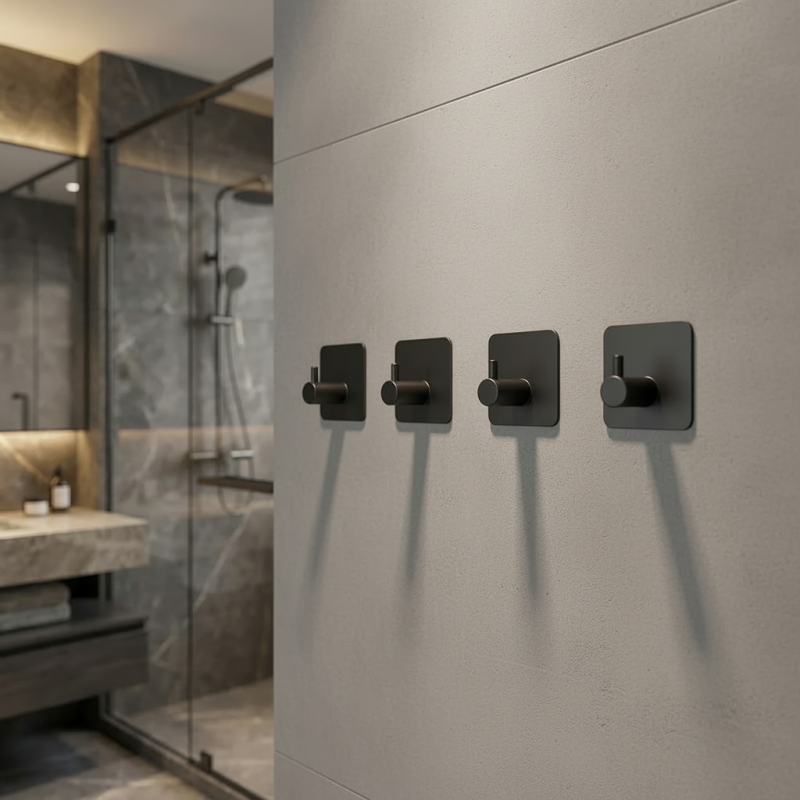 Jednoduchý a designový věšák vhodný do koupelny nebo kuchyně. Na zadní straně je oboustranná páska, kterou jednoduše přilepíte na místo, kam má být věšák umístěn.
