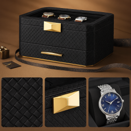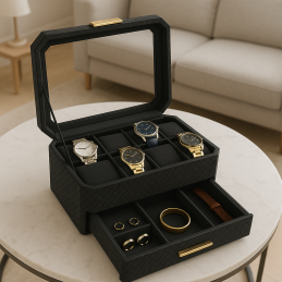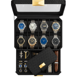 Horní vrstva: 8 přihrádek na hodinky všech velikostí, které jsou bezpečně uloženy a zároveň vystaveny přes skleněné víko.