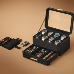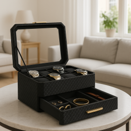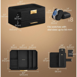 Kapacita: 8 přihrádek na hodinky + zásuvka na šperky/doplňky