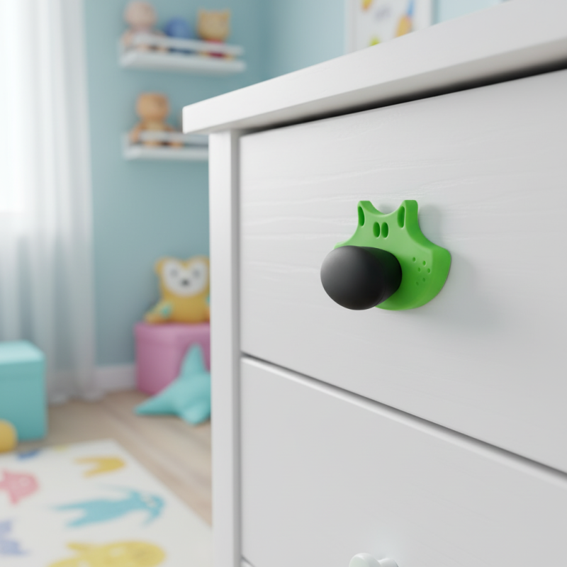 Úchytka HELLO je navržena speciálně pro dětské prostředí – kombinuje měkký, pružný silikon s hravým designem, který zaujme i ty nejmenší. Silikonový materiál je příjemný na dotek, neobsahuje ostré hrany a při nárazu nepředstavuje riziko poranění, což z ní činí ideální řešení pro malé děti.