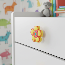 Veselá nábytková úchytka ve tvaru květiny je ideální volbou do dětských pokojů. Díky barevnému provedení oživí každý dětský nábytek a dodá mu hravý charakter.