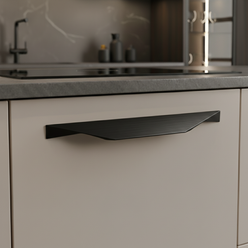Úchytka VALENCIA v moderním provedení černá broušená působí mimořádně elegantně a zároveň výrazně. Ostré, dynamické linie v kombinaci s jemným broušeným povrchem vytvářejí luxusní kontrast, který dokonale doplní tmavý nábytek, dřevěné dekory i minimalistické interiéry.