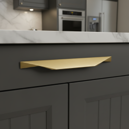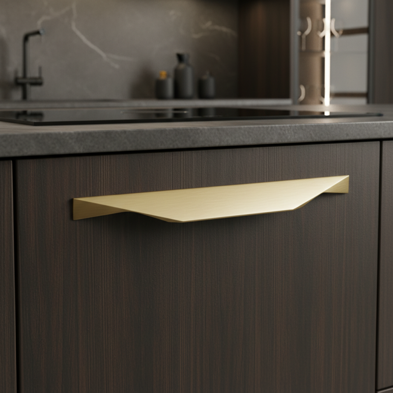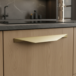 Úchytka VALENCIA v luxusním provedení kartáčované zlato přináší do interiéru teplý prémiový akcent a atraktivní moderní design. Její dynamické, ostře řezané linie působí elegantně a zároveň výrazně, díky čemuž skvěle doplní moderní kuchyňské linky, obývací sestavy, šatní skříně i designové prostory.