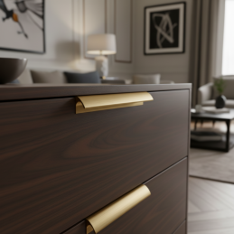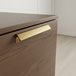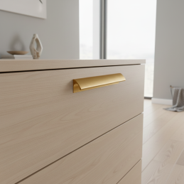 Úchytka NALU ve zlatém broušeném provedení je ideální volbou pro ty, kteří hledají lehký hliníkový materiál, prémiový vzhled a elegantní detail, který dodá nábytku osobitý a nadčasový charakter.