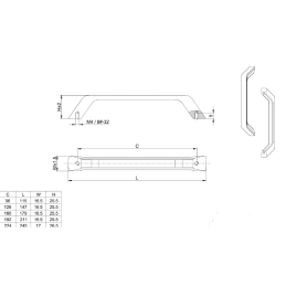 Rozteč 192 mm – celková délka 211 mm, šířka 16,5 mm, výška 25,5 mm