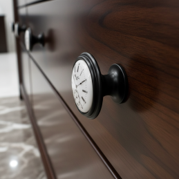 Designová úchytka CLOCK v černém provedení je výjimečný doplněk, který okamžitě upoutá pozornost motivem elegantního hodinového ciferníku. Spojení keramiky a kovu zajišťuje nejen vizuální atraktivitu, ale také vysokou odolnost a kvalitu zpracování. Úchytka pochází od renomovaného italského výrobce, což zaručuje precizní design i dlouhou životnost.