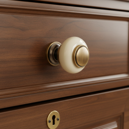 Porcelánová knopka RAENA v elegantní zlaté patině je nadčasovým doplňkem, který promění každý kus nábytku ve stylový a luxusně působící prvek. Spojení krémového porcelánu a kovových detailů v jemné patině vytváří harmonický a klasický vzhled vhodný do různých typů interiérů.