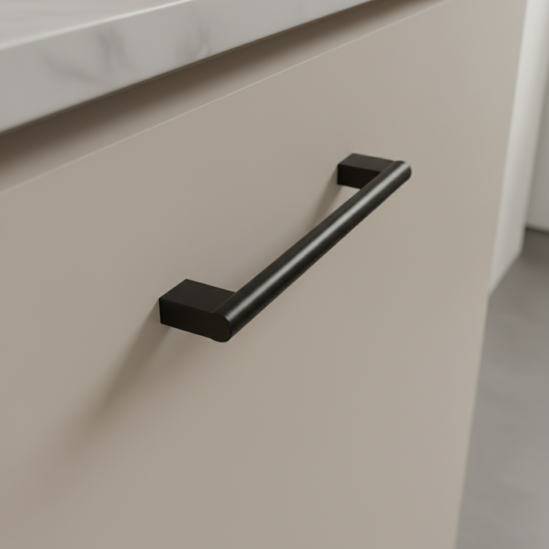 Moderní nábytková úchytka SORTA v elegantním provedení černá matná je ideálním řešením pro kuchyňský, koupelnový i obývací nábytek. Matný povrch působí luxusně, minimalisticky a dokonale ladí se dřevem, betonem, bílou i barevnými dekory.Kulatý profil úchytky kombinovaný s hranatými nožičkami vytváří nadčasový a univerzální design.
