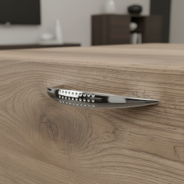 Elegantní nábytková úchytka TYLLAU v lesklém chromovém provedení dodá vašemu nábytku moderní a atraktivní vzhled. Charakteristická je pro ni dekorativní plocha s jemnými kovovými tečkami, které vytvářejí originální designový prvek.