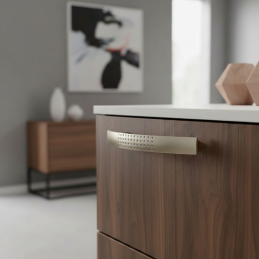 Matný nikl je oblíbenou volbou pro moderní interiéry – je elegantní, decentní a praktický. Úchytka VELLEN v tomto provedení podtrhne čistý design nábytku a dodá mu jemný technický, ale zároveň harmonický vzhled.
