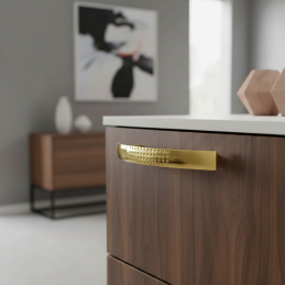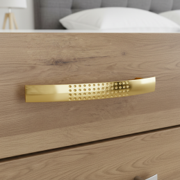 Úchytka VELLEN v lesklém zlatém provedení dodá vašemu nábytku nádech luxusu a exkluzivity. Její jemně prohnutý tvar v kombinaci s dekorativní strukturou drobných teček vytváří výrazný, ale stále elegantní designový prvek vhodný do moderních i glamour interiérů.
