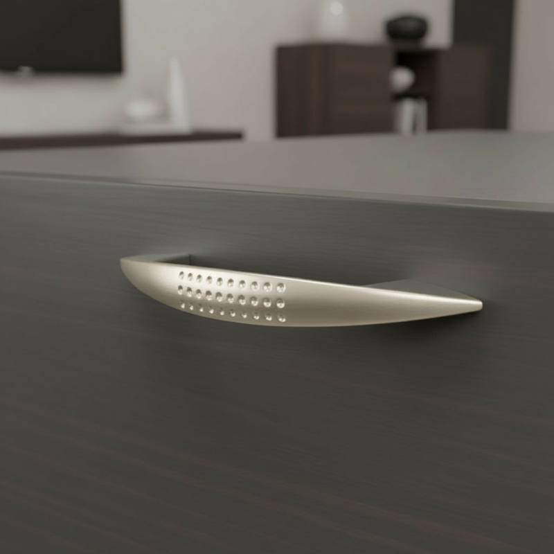 Stylová úchytka TYLLAU v niklovém matném provedení nabízí moderní a zároveň nadčasový vzhled, který elegantně doplní kuchyňský, koupelnový i sektorový nábytek. Jemné dekorativní kovové tečky na přední straně dodávají úchytce jedinečný charakter a vizuálně ji odlišují od běžných modelů.