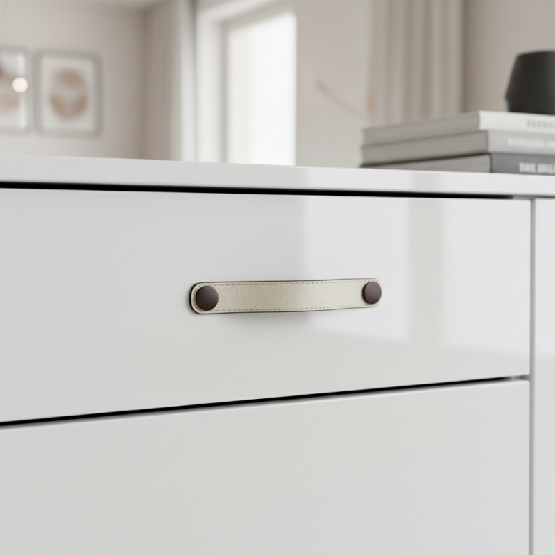Stylová kožená úchytka CASE v bílém provedení představuje elegantní doplněk pro moderní i klasický nábytek. Pravá kůže s jemnou texturou dodává interiéru luxusní a čistý vzhled. Kontrastní tmavé kovové krytky vytvářejí atraktivní designový detail.