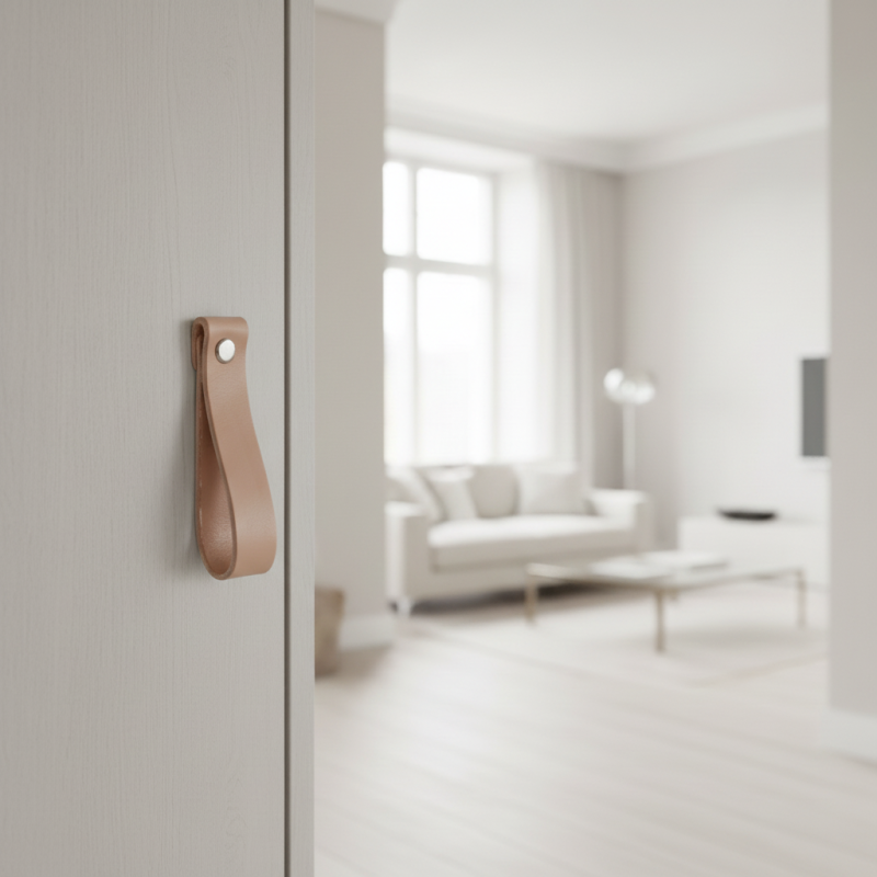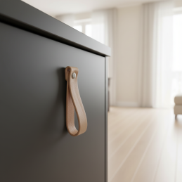 Exkluzivní knoflíková rukojeť z pravé kůže v kombinaci s matnou hliníkovou koncovkou a výškou 98 mm. Lze kombinovat s velkými rukojeťmi.