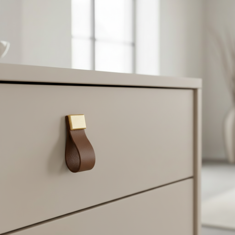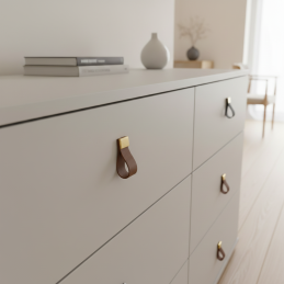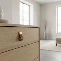 Kombinace pravé hnědé kůže a zlaté kovové koncovky působí nadčasově, esteticky a velmi příjemně na dotek. Úchytka vytváří měkký, působivý akcent a dodá nábytku výjimečný vzhled.
