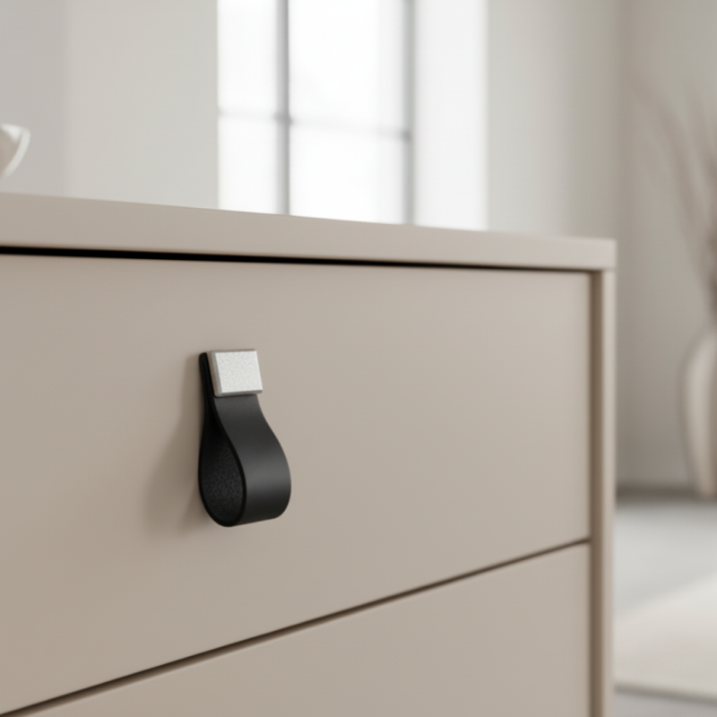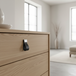 Verze černá kůže + hliníková koncovka krásně ladí s moderním nábytkem, světlými dvířky i industriálními prvky. Elegantní, funkční a příjemná na dotek – ideální volba pro nadčasový interiér.