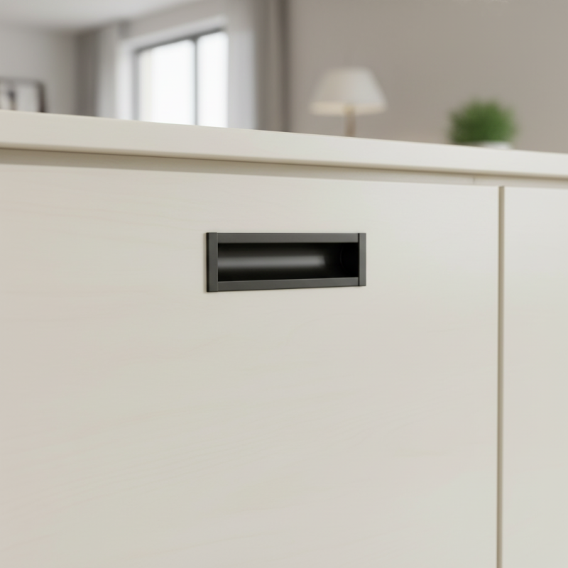 Moderní minimalistická úchytka určená pro zafrézování do plochy dvířek nebo zásuvek. Elegantní matná černá povrchová úprava dodává nábytku čistý a moderní vzhled.