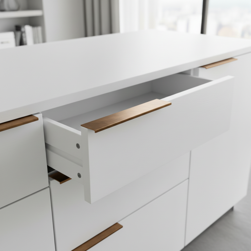 Úchytka se montuje z přední strany na hranu dvířek nebo zásuvek.