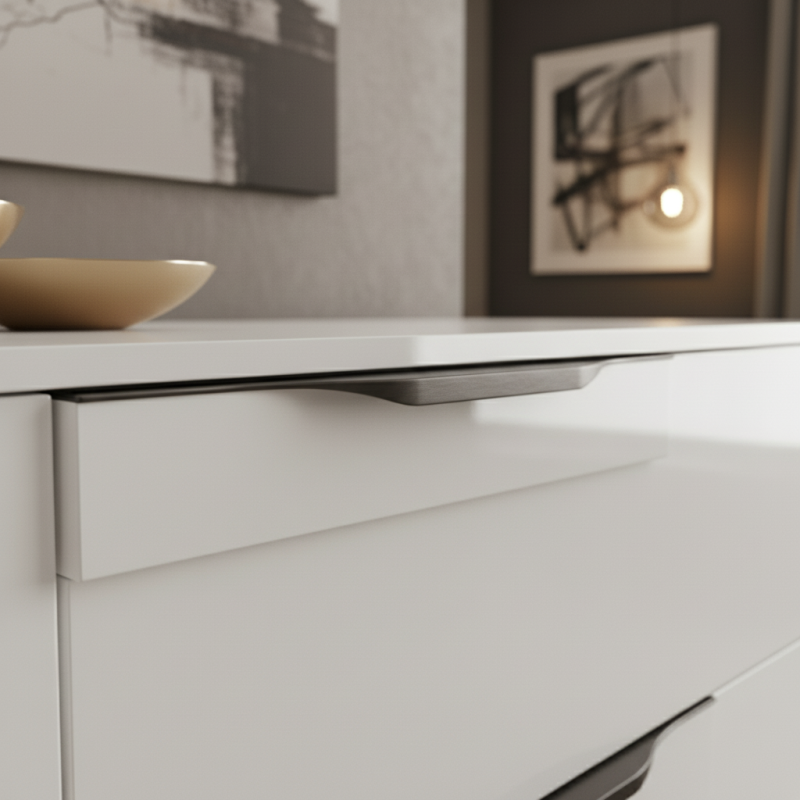 Díky tvaru, při kterém úchytka překrývá celou jednu stranu dvířek, vzniká elegantní lemování a jedinečný vizuální efekt. Tento design zajišťuje komfortní otevírání bez vystupujících prvků, což zároveň přispívá k bezpečnosti a estetickému minimalismu.