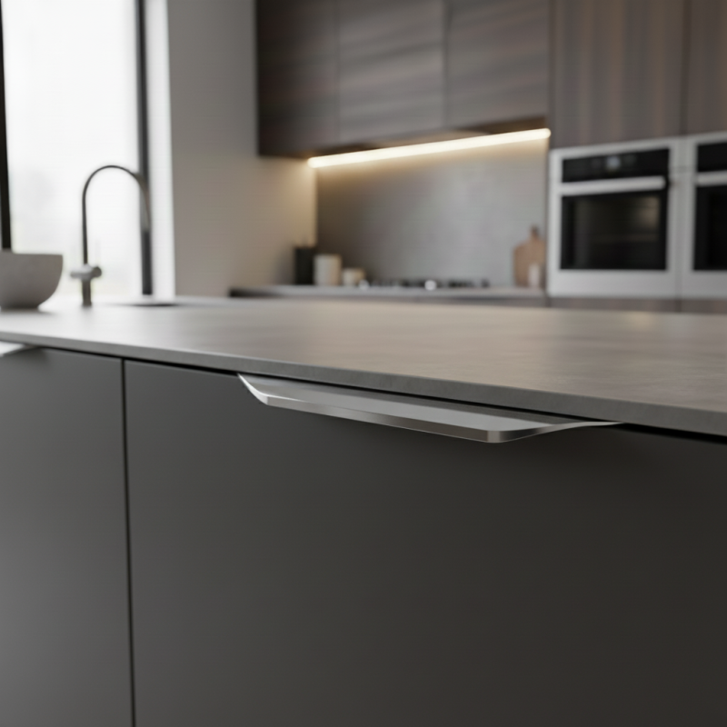 Designové madlo na hraně dveří s montáží ze zadní strany dveří, dostupné v 11 velikostech. Rozteč otvorů na výběr je celková délka kliky.