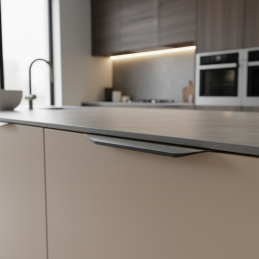Úchytka ALICANTE v moderním provedení černá matná je elegantním řešením pro nábytek, kde je prioritou čistý a minimalistický design. Montuje se ze zadní strany dvířek, takže z čelního pohledu nejsou viditelné žádné šrouby, což zaručuje perfektní estetický výsledek.