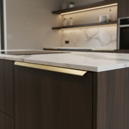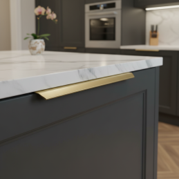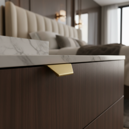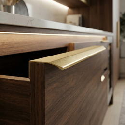 Elegantní hranová úchytka MAURA v provedení zlatá broušená je moderním řešením pro čistý a minimalistický vzhled nábytku. Montuje se na horní hranu dvířek, čímž vytváří nenápadný, ale výrazný designový detail. Broušený zlatý povrch dodává interiéru luxusní a nadčasový charakter.