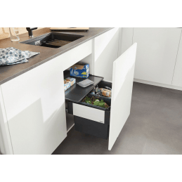 Systém je určen pro spodní skříňky se šířkou 60 cm a umožňuje pohodlné třídění odpadu v samostatných nádobách s ergonomickými úchyty.
