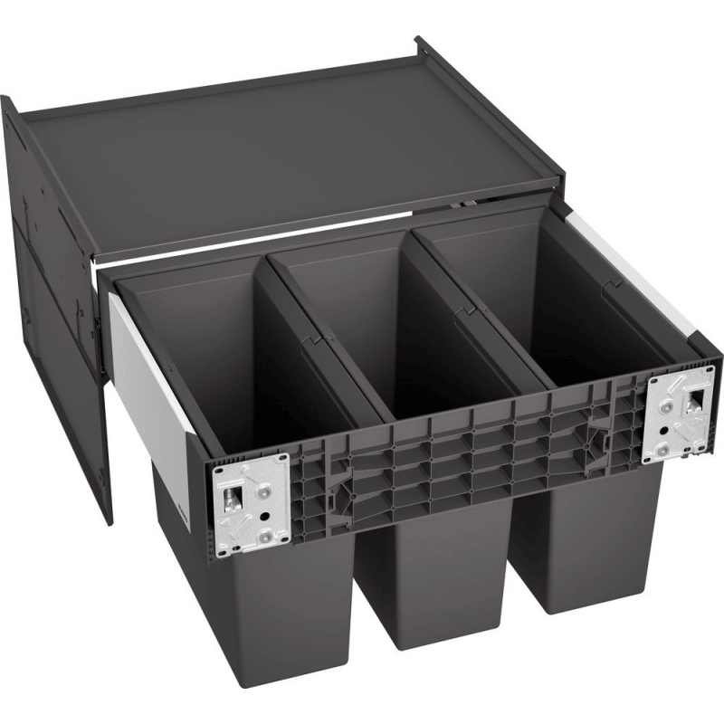 Systém je určen pro spodní skříňky se šířkou 60 cm a nabízí tři samostatné nádoby, každou s praktickým madlem pro pohodlnou manipulaci.