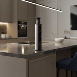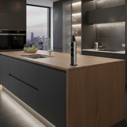 Stylová výsuvná zásuvka v elegantním černém provedení je ideálním řešením pro moderní kuchyně, pracovní stoly či kanceláře. Po stisknutí se zcela skryje v pracovní desce, čímž šetří místo a působí esteticky čistým dojmem. Jednoduchým stisknutím se vysune a okamžitě umožní využívat všechny konektory.