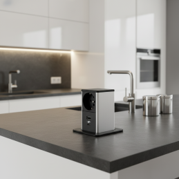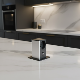 Zásuvka se jednoduše vysouvá nahoru a po použití ji zasunete zpět do pracovní desky. V zavřené poloze tvoří minimalistický černý matný kryt, který působí esteticky a neruší prostor.